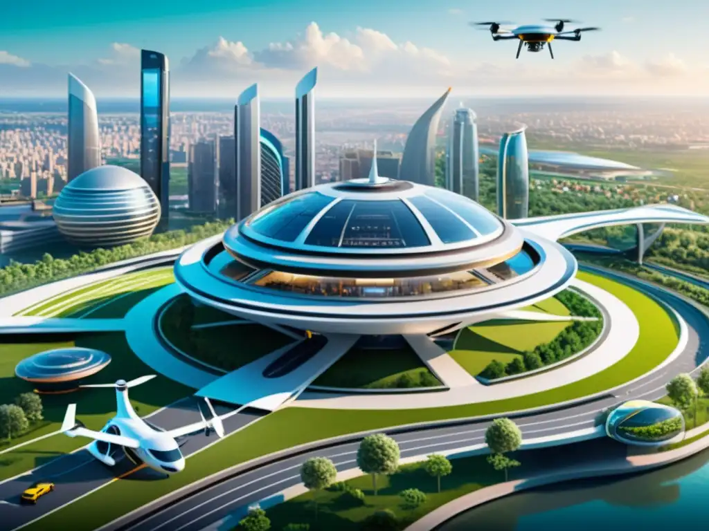 Estaciones de drones y taxis voladores futuristas en una ciudad ultramoderna llena de tecnología de vanguardia